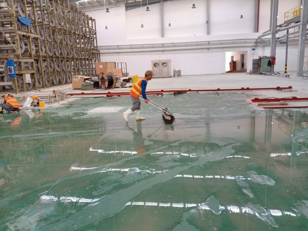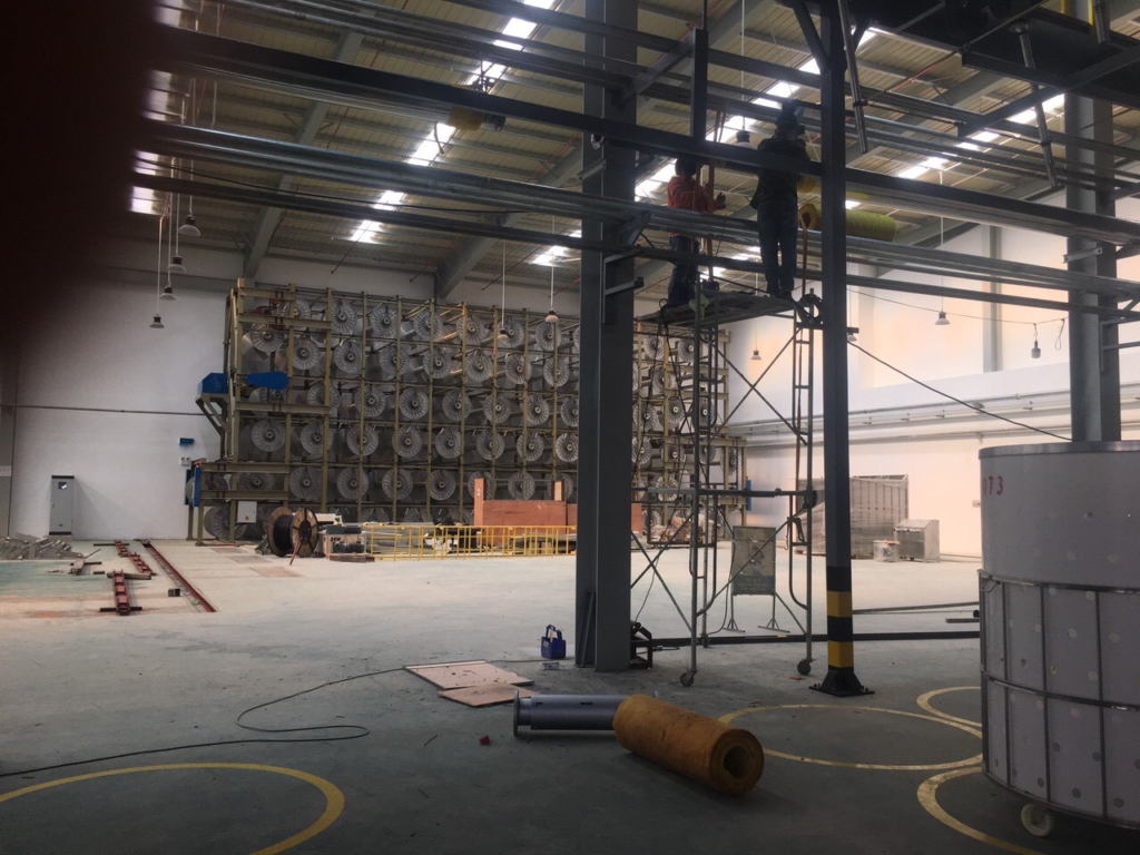 在织造车间方面,现场重点开展防水工程施工与细部优化作业,包括空调机房防水处理、风道沟防水清理、设备基础打磨及墙面修整等工作同步推进。同时,地面清洁、墙脚防水加热处理及室内伸缩缝安装有序展开,并完成A-B轴防水蓄水测试,确保结构安全与使用性能。