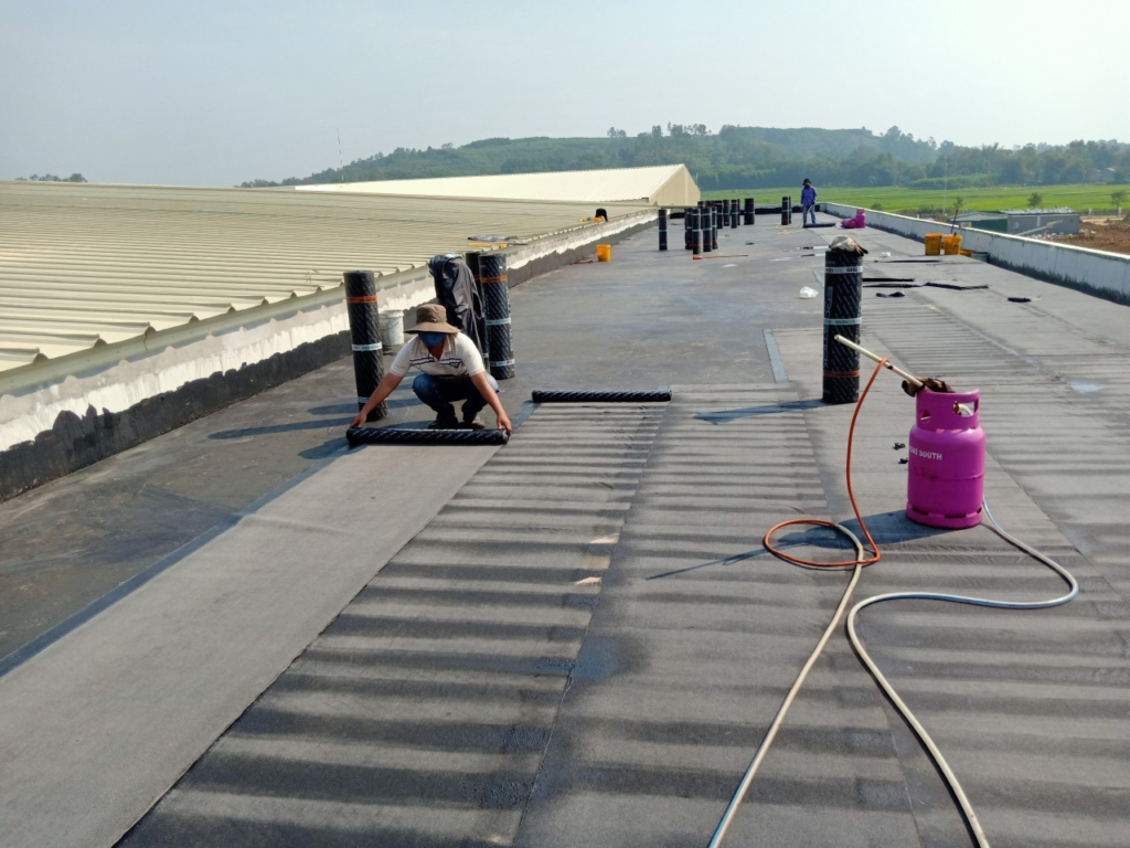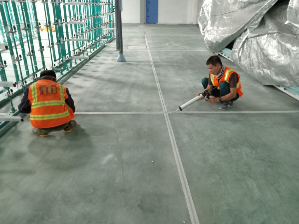 原料车间施工涵盖地坪清洁与Sikaflex填缝、防水及排水坡度施工、墙面腻子与涂装等关键工序,同时卫生间地砖勾缝、屋面防水施工及花岗岩大厅铺装同步推进,整体空间品质不断提升。